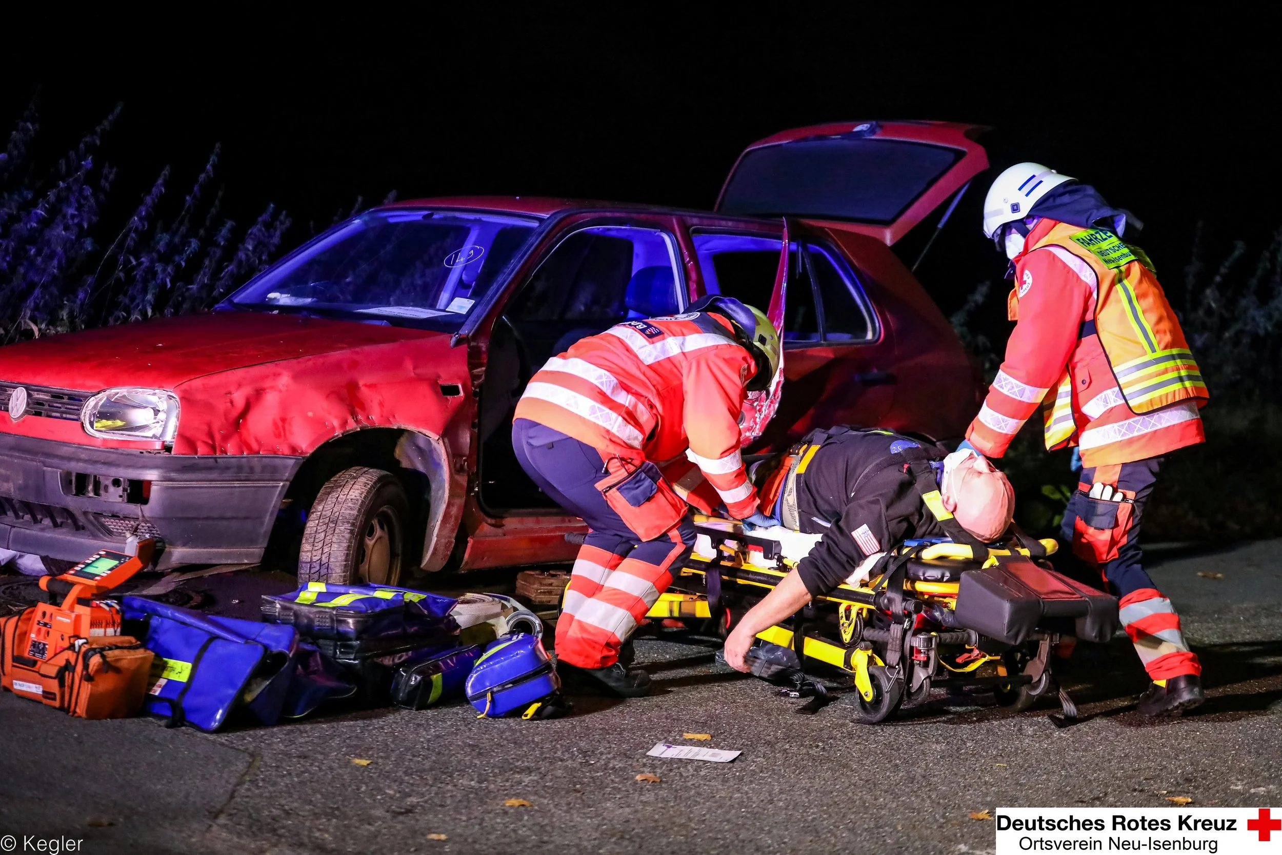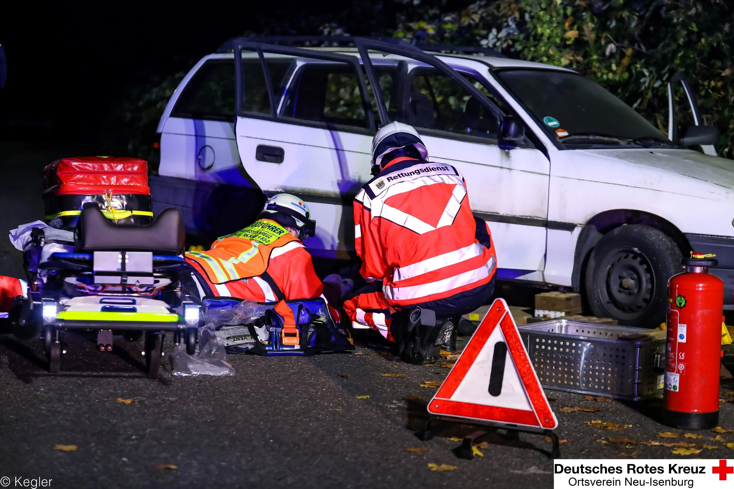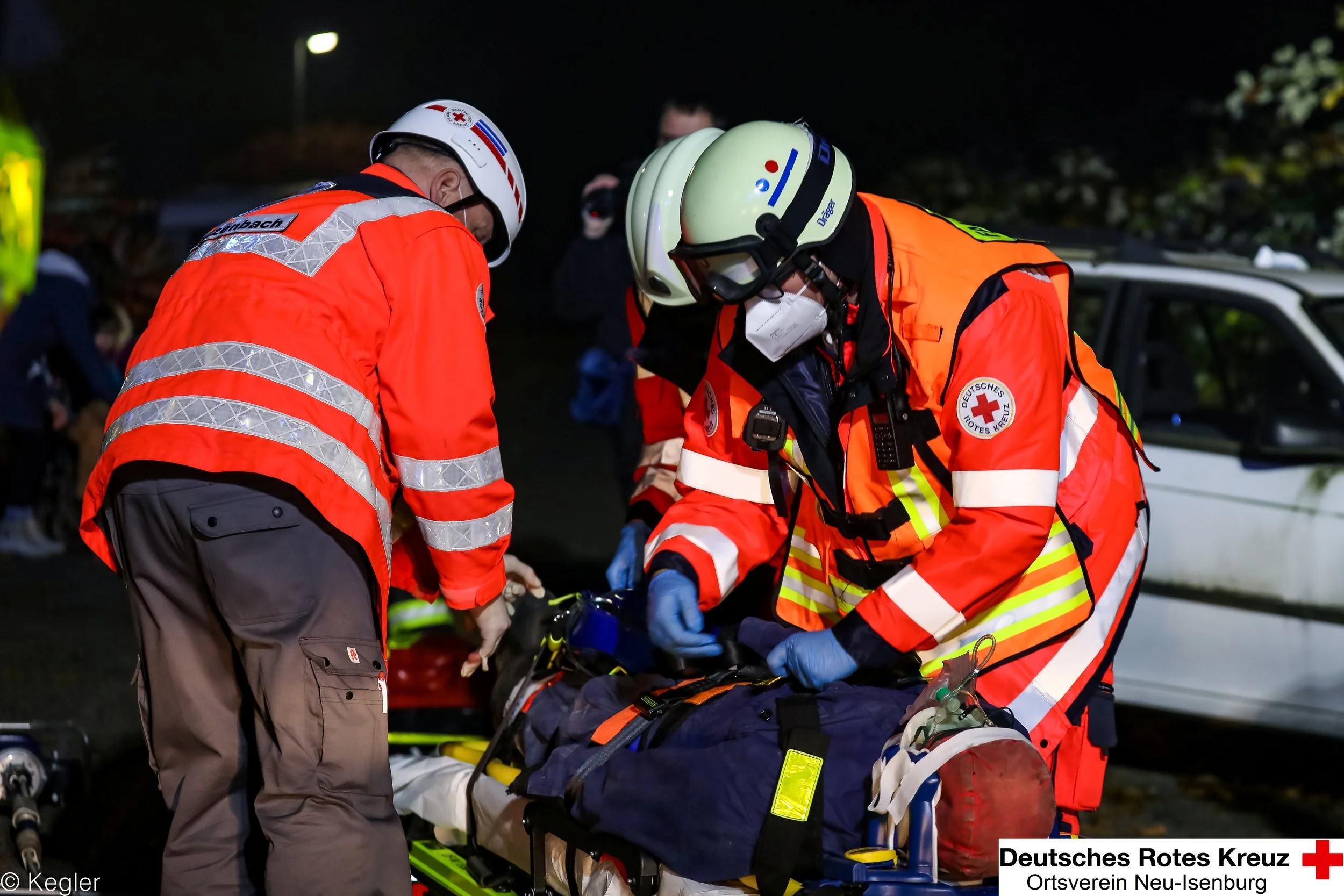 Während die Feuerwehr sich um die Absicherung und das Ausleuchten der Einsatzstelle kümmerte und die technische Rettung der beiden eingeklemmten Personen vorbereitete, begann das N-KTW-Team mit der Versorgung der schwer verletzten Person unter dem PKW.